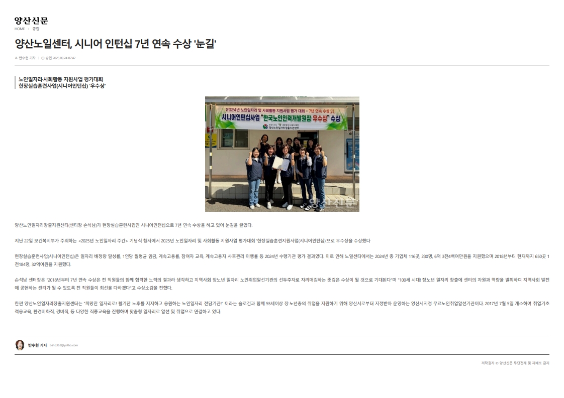 양산노일센터, 시니어 인턴십 7년 연속 수상 '눈길'(양산신문)