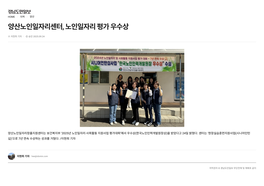 양산노인일자리창출지원센터,노인일자리평가우수상(경남도민일보)