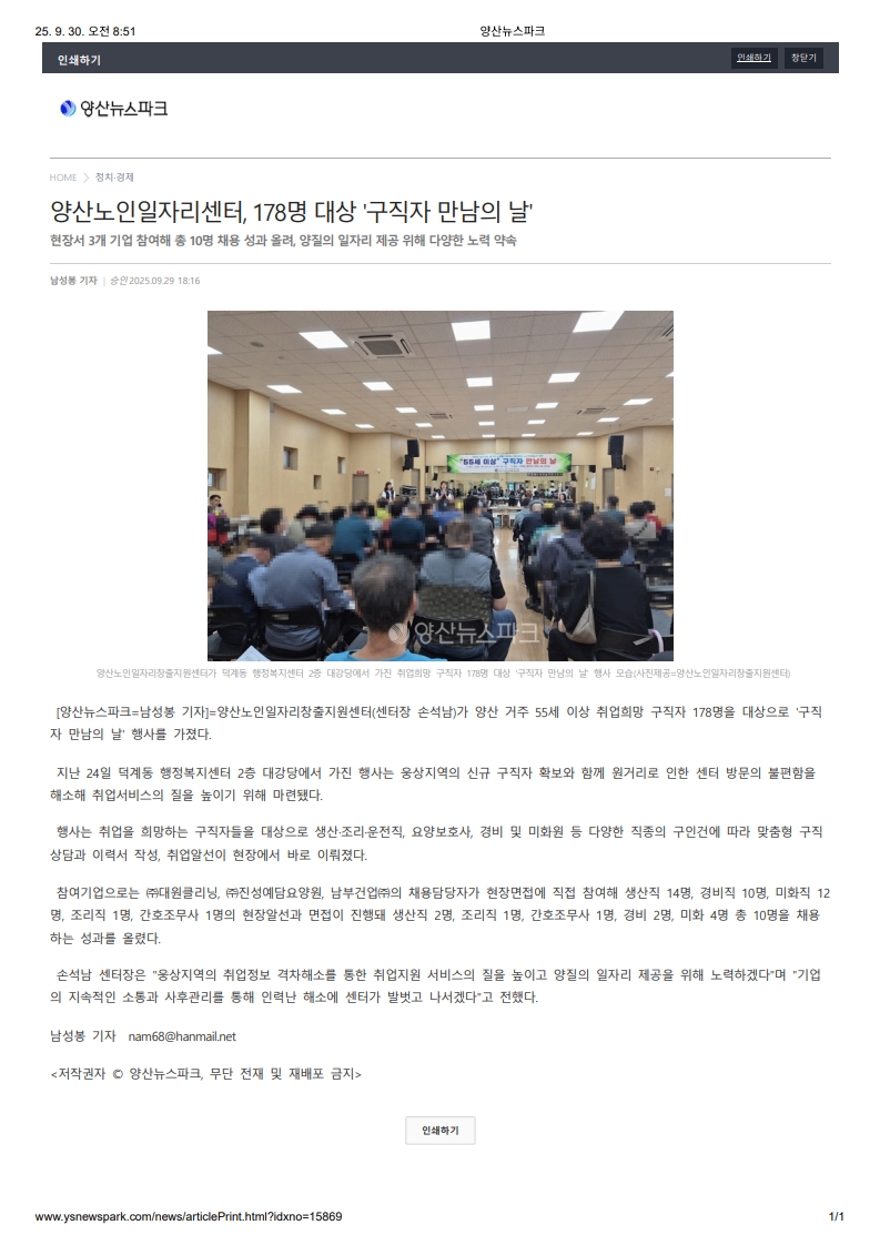 양산노인일자리센터, 178명 대상 '구직자 만남의 날(양산뉴스파크)