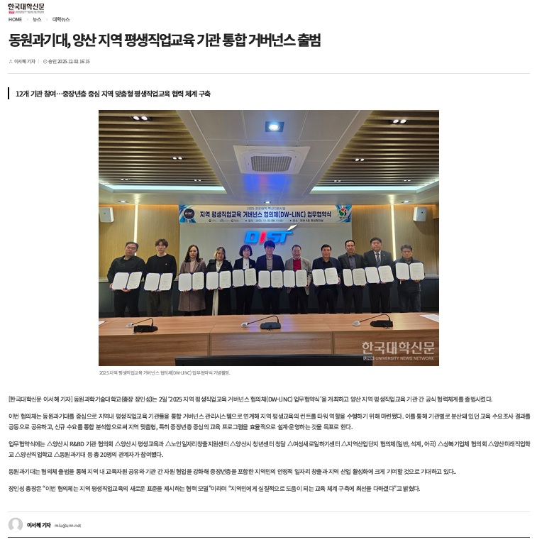 동원과기대, 양산 지역 평생직업교육 기관 통합 거버넌스 출범(한국대학신문)