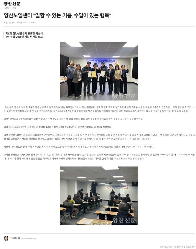 양산노일센터 일할 수 있는 기쁨, 수입이 있는 행복(양산신문)