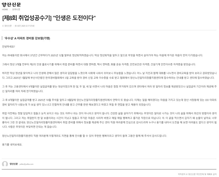 [제8회 취업성공수기]은퇴 후 재취업을 준비하며(양산신문)