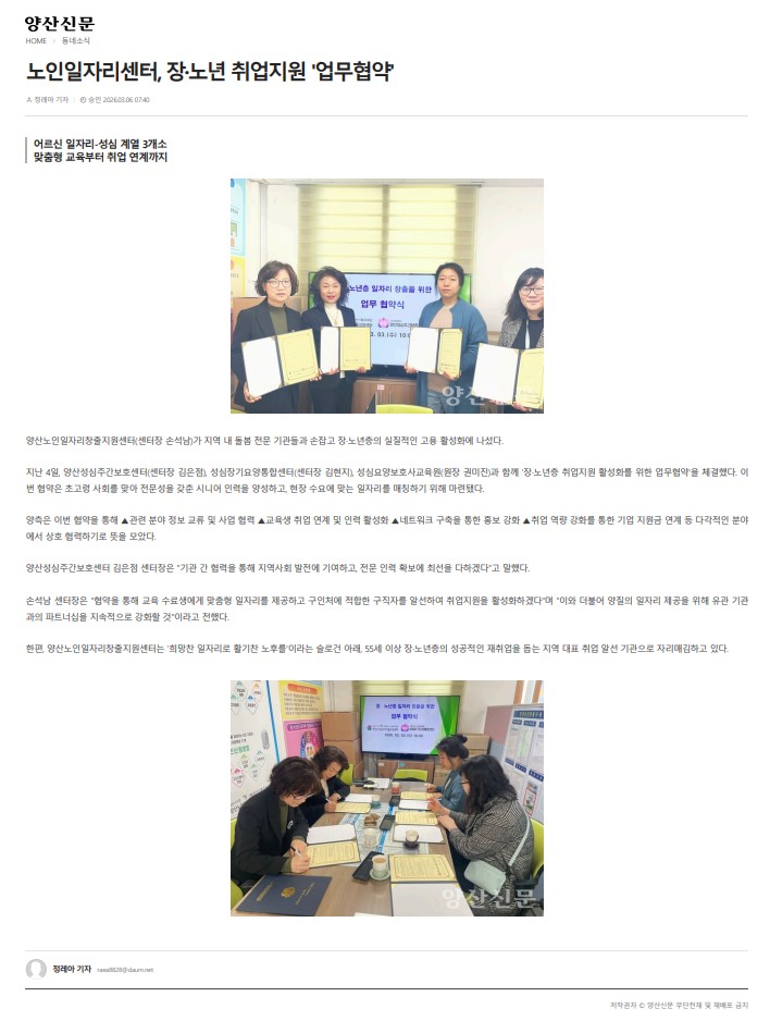 노인일자리센터, 장·노년 취업지원 '업무협약'(양산신문)