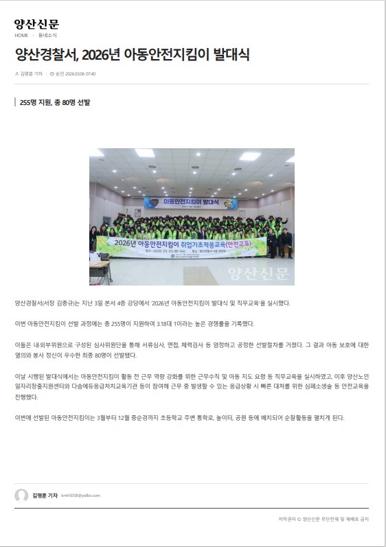 양산경찰서 , 2026년 아동안전지킴이 발대식(양산신문)