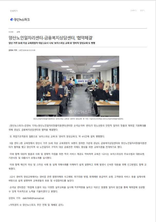 양산노인일자리센터-금융복지상담센터,‘협약체결’(양산뉴스파크)