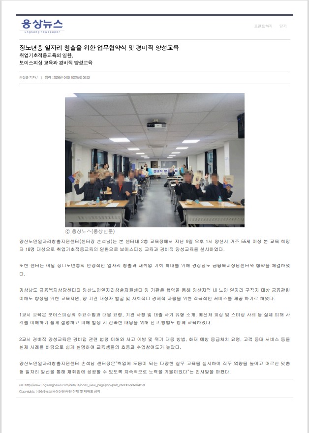 장노년층 일자리 창출을 위한 업무협약식 및 경비직 양성교육(웅상뉴스)